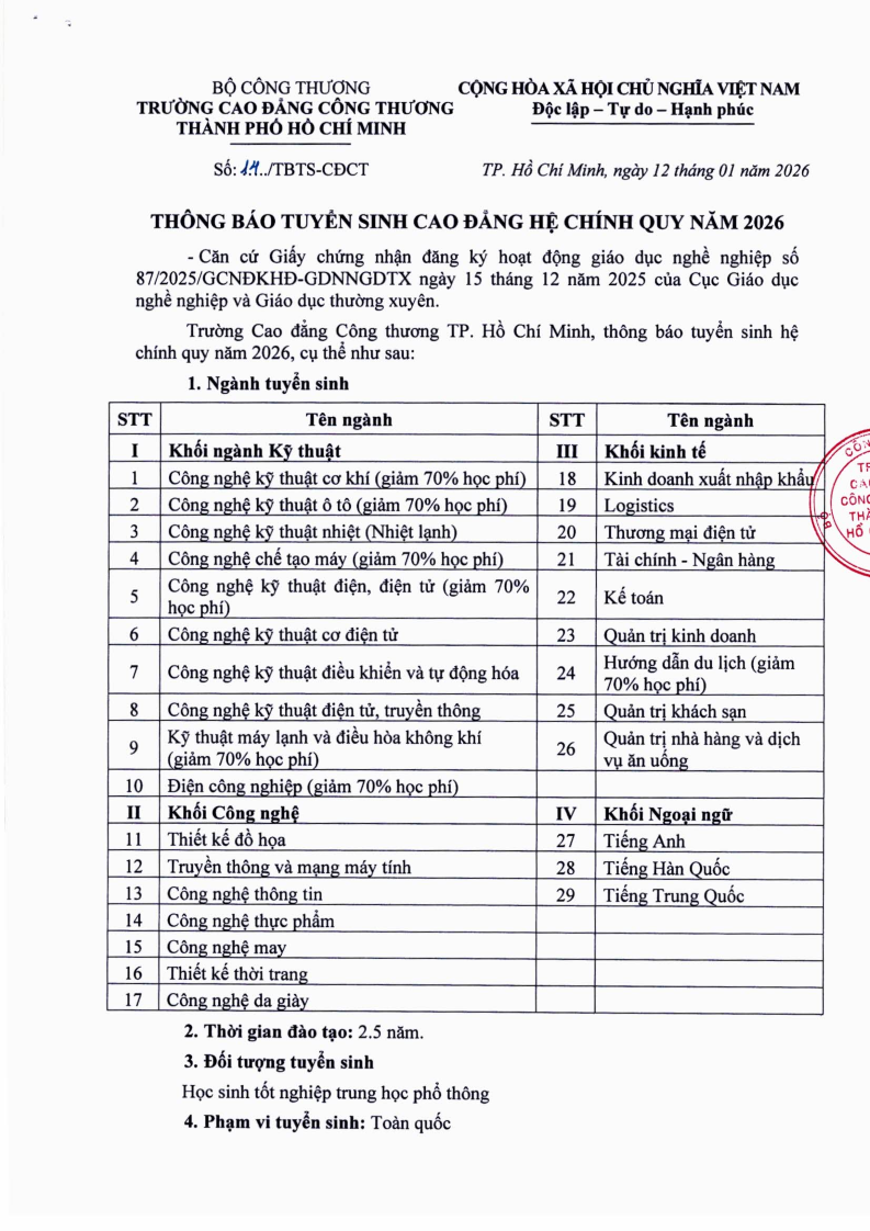 3. Thông báo tuyển sinh Cao đẳng hệ chính quy năm 2026